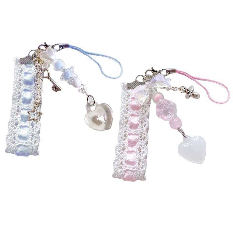 Dainty Lace Ribbon Keyring Cute Heart Pendant Keychain Colorful Beaded Phone Lanyard Multi-Functional Bags Accessories