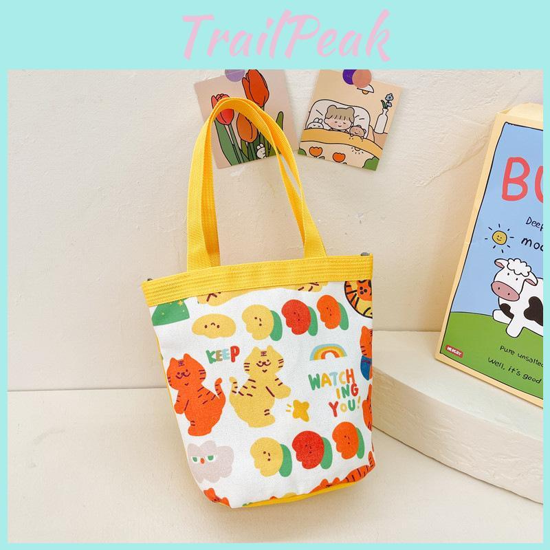 This canvas tote bag features a charming cartoon tiger design, measuring approximately 12 inches in diameter and made from durable polyester lining. Its spacious interior, secured by a zipper closure, supports daily essentials for children and young students. Ideal for everyday use, it complements casual outfits and is easy to maintain by wiping with a damp cloth.