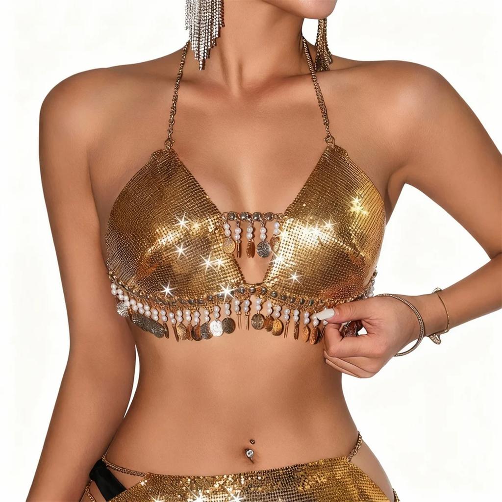 Top sutien sexy cu umerii goi pentru femei cu ciucuri metalici și paiete