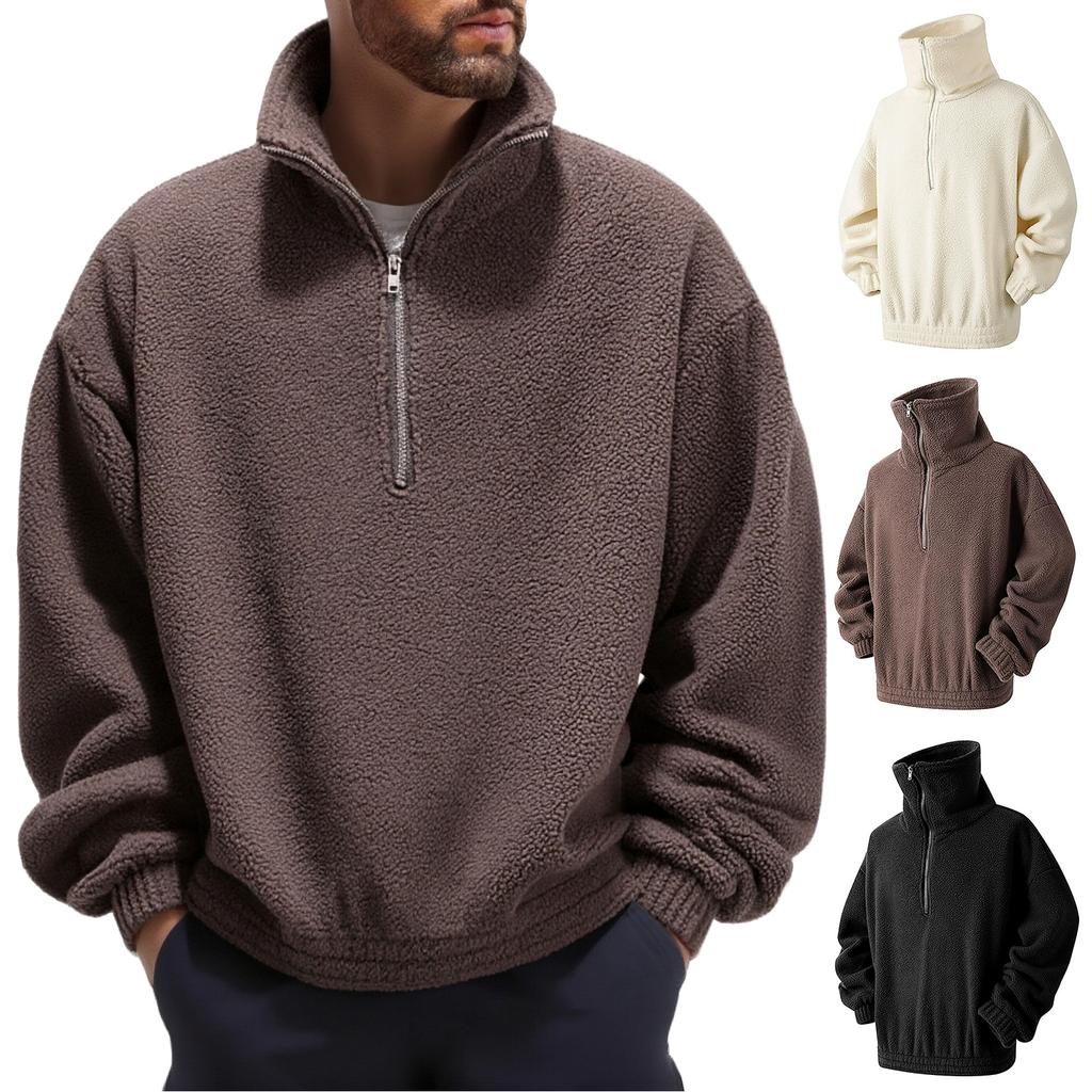 Men's Casual, Trendy, Retro Solid Color Half-pull Long-sleeved High-neck Top, Men's Thickened Warm Lambskin Sweatshirt