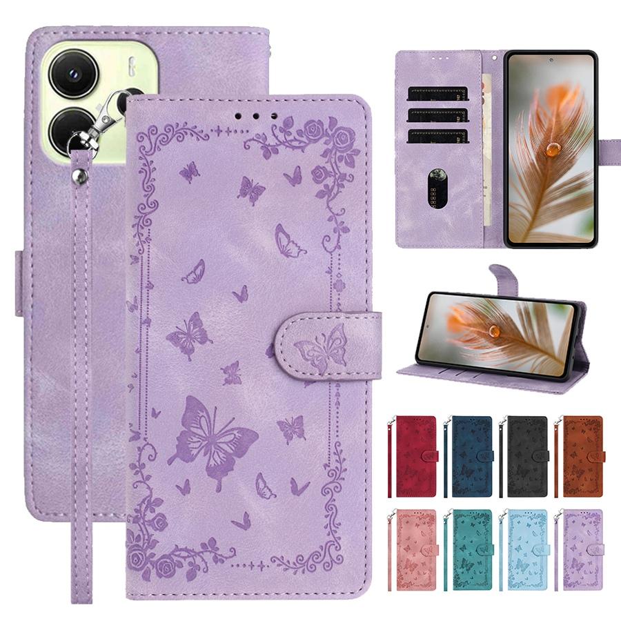 Husă Retro cu Flori și Fluturi în Relief pentru Xiaomi Redmi Note 15 14 13 12 Piele PU Slot pentru Card Husă Portofel cu Curea de Mână pentru Redmi 15C 14C 13C
