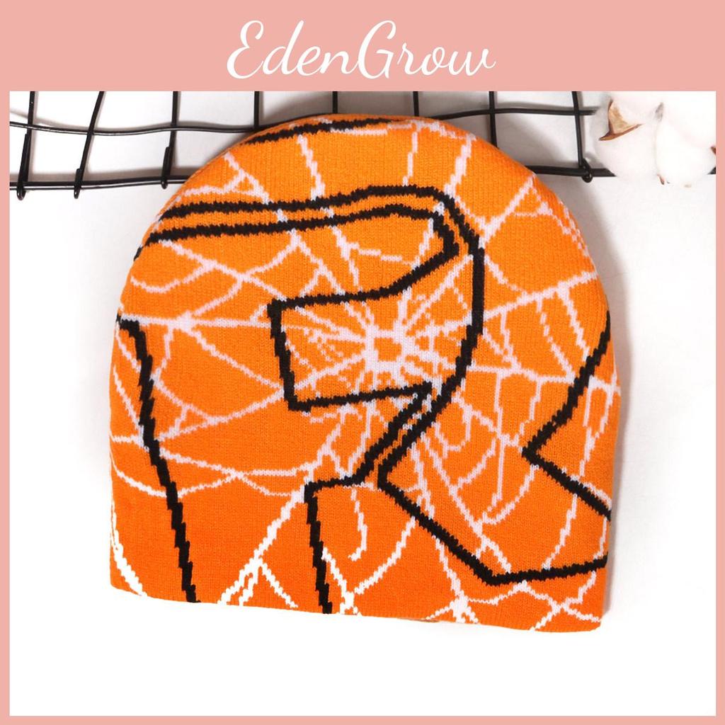 This knit hat features a seamless, round-top design crafted from acrylic fabric, offering reliable warmth for cold weather. it displays a patterned spider web motif in black and orange, ideal for street style and urban fashion. Suitable for autumn and winter seasons, it supports casual and hip-hop-inspired looks. Wipe clean with a damp cloth to maintain its textured jacquard finish.