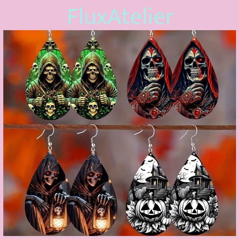 These Halloween-themed acrylic drop earrings feature a sleek water-drop shape with skull head designs, adding a touch of spooky elegance. Made of durable acrylic, with printed details for vivid appearance. Suitable for festive events or costume parties, they support easy cleaning with a damp cloth, providing a lightweight and versatile accessory for both men and women.