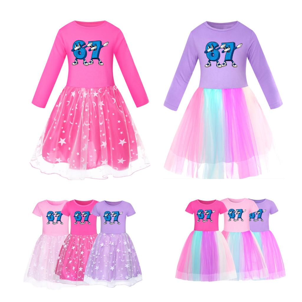 5226 Kids Girls Steal a Brainrot 67 Six Seven Print Mesh Rainbow Round Neck Casual Casual Cotton Dress