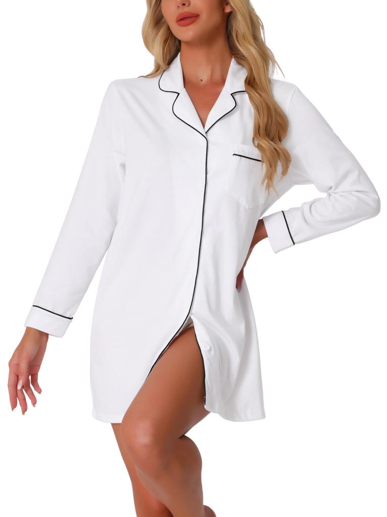 Long sleeves, front button, notch lapel, pajama shirt dress, one pocket, mini length