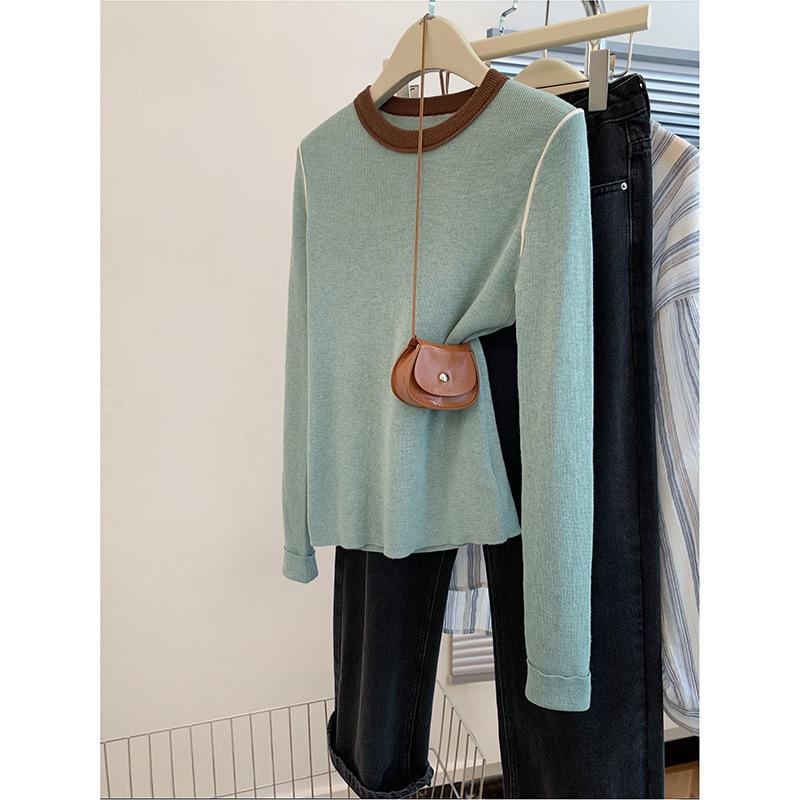 Green Shoulder Crew Neck Long Sleeve Knitted Sweater Women's Spring and Autumn Early Autumn Sweater Slim Fit Bottom Shirt Premium Top