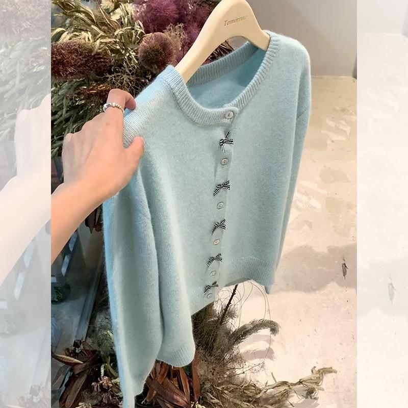 Blue knitted cardigan jacket women's spring and autumn bow sweater wearing raccoon velvet soft waxy top