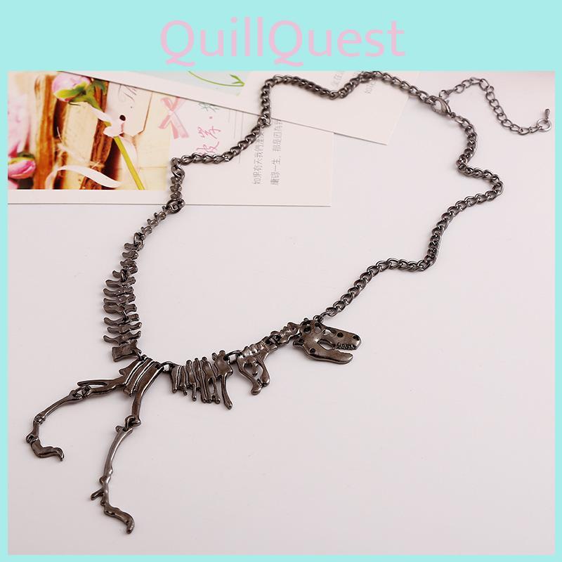 This dinosaur skeleton pendant necklace features an alloy construction with electroplated finishes in gun black, gold, silver, or rose gold, it includes a detailed animal-themed design and a chain style resembling a whip. Ideal for travel, casual wear, or as a gift, it supports everyday styling and special occasions. The alloy pendant is easy to clean with a damp cloth, ensuring lasting appearance.