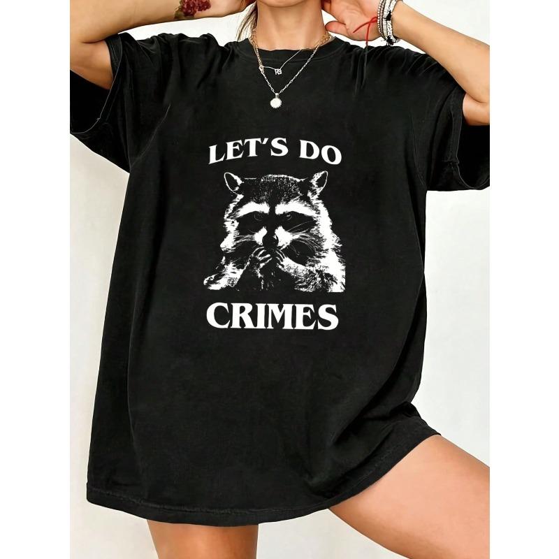 Oversized T Shirt Black Raccoon Let's Do Crimes Graphic Print Casual Streetwear Top For Women Summer Outfit