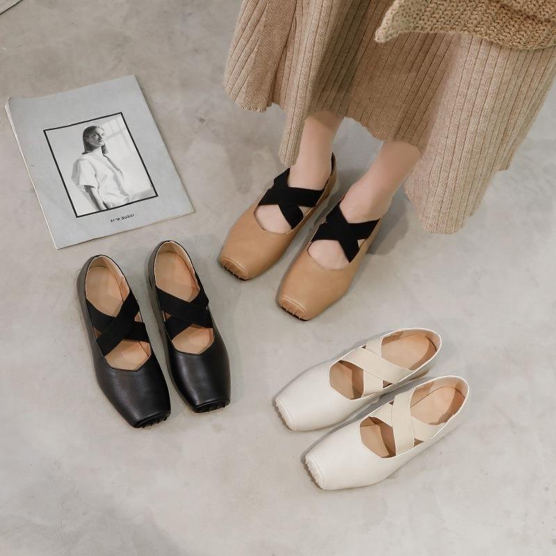 Ballet Shoes with A Square Toe and A Shallow Opening with Straps