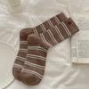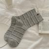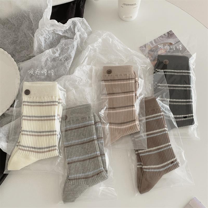 Autumn and Winter, Slightly Pressed Heel Button Pure Cotton Mid-calf Socks, Girls' School Style Pile Socks, Vertical Striped Long Calf Socks