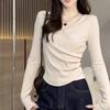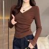 Spring Autumn V-neck Solid Color Folds T-shirt Women Long Sleeve Waist Tee All-match Pullovers Bottomed Top