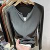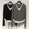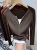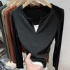 Zipper fake two-piece top women's spring contrasting color splicing card waist pleated long-sleeved T-shirt bottoming shirt tide