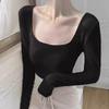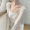 Square collar leaking collarbone pink top, spring polished inner long-sleeved slim-fitting and thin, pure desire versatile bottoming shirt
