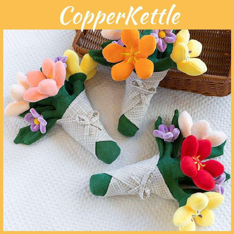 Ursulet de plus drăguț cu un aranjament floral frumos în nuanțe de portocaliu, roz și roșu