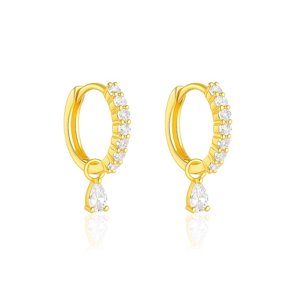 925 gold-plated sterling silver CZ huggie hoops featuring pear drop dangles. A blend of classic sparkle and modern elegance.