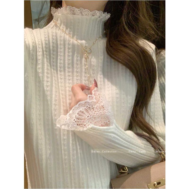 Temperament lace semi-turtleneck top women's autumn and winter slim-fit stacked design sense with knitted sweater fashionable bottoming shirt