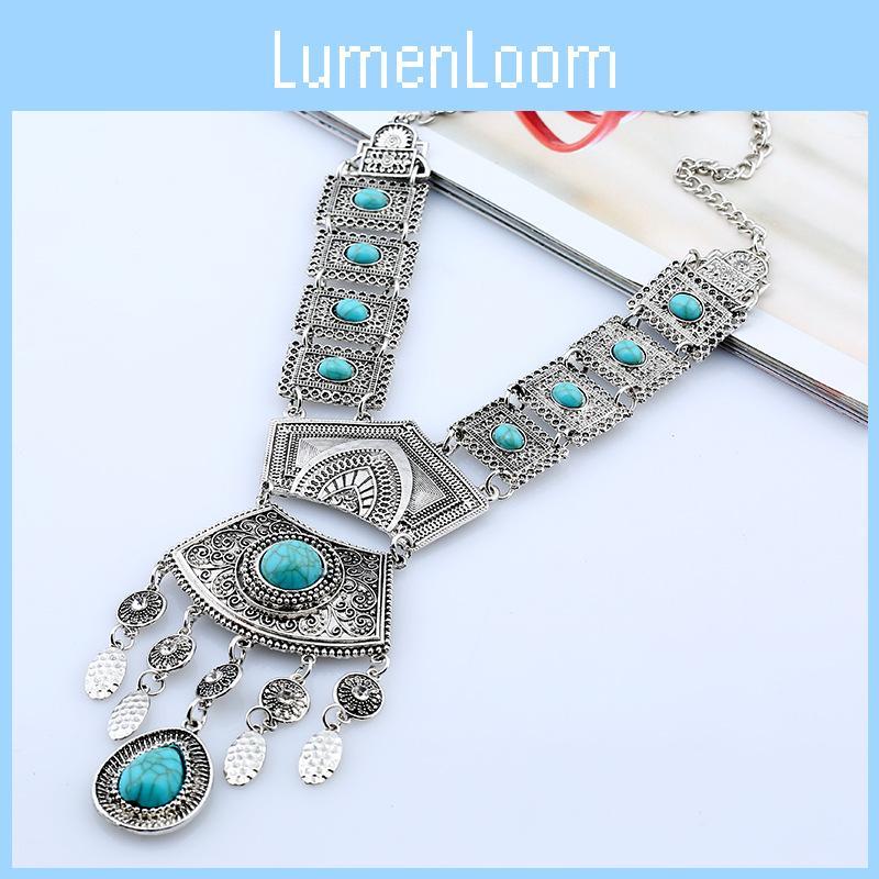 Ethnic Style Simulation Gemstone Decor Women Metal Necklace With Tassel For Vintage Jewelry Enthusiasts