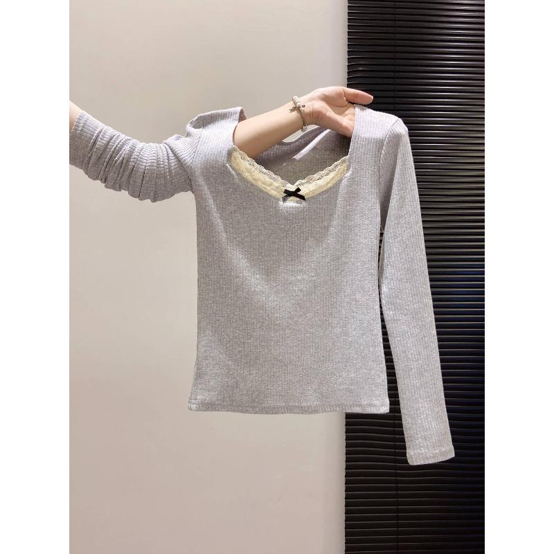 Square collar top Skinny Spice Girl inner bottoming shirt Autumn lace long-sleeved knitted shirt Women's sweater