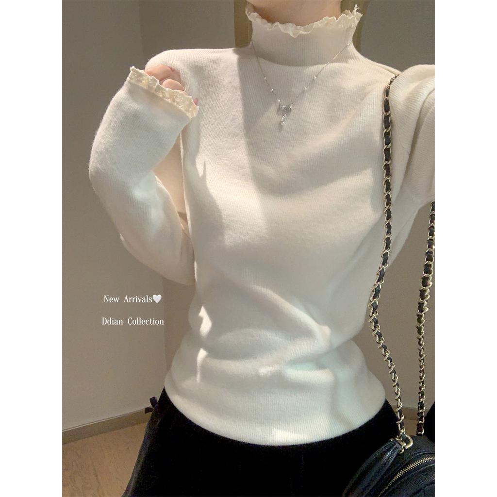 Lace semi-turtleneck knitted sweater women's autumn and winter slim-fitting and thin shoulder long-sleeved bottoming sweater basic top