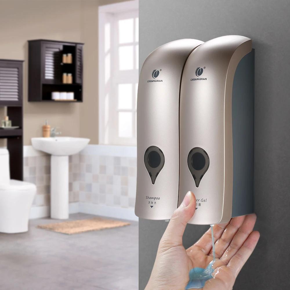 300ml*2 Wall Mounted Double-Head Manual Soap Dispenser Shower Gel Liquid Shampoo Dispenser Holder W/ Adhesive Stickers for Hotel