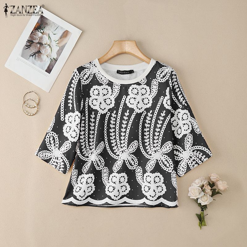 ZANZEA Bluză de vară cu mânecă scurtă și guler rotund pentru femei, casual, cu imprimeu