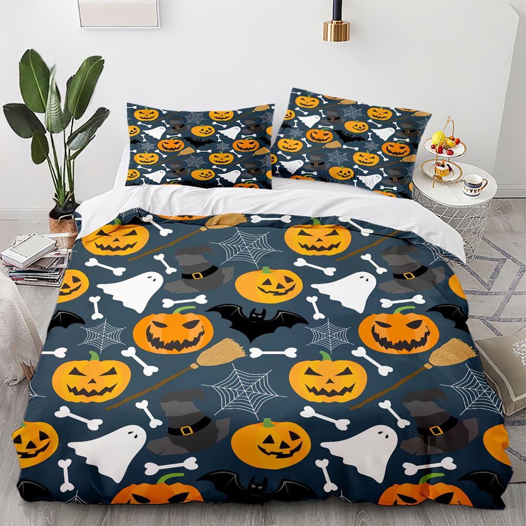 Halloween Quilt Cover Set Pumpkin Bat Spider Web Holiday Theme Bedding Set 3pcs Set, Fun Halloween Decor Quilt Cover Set