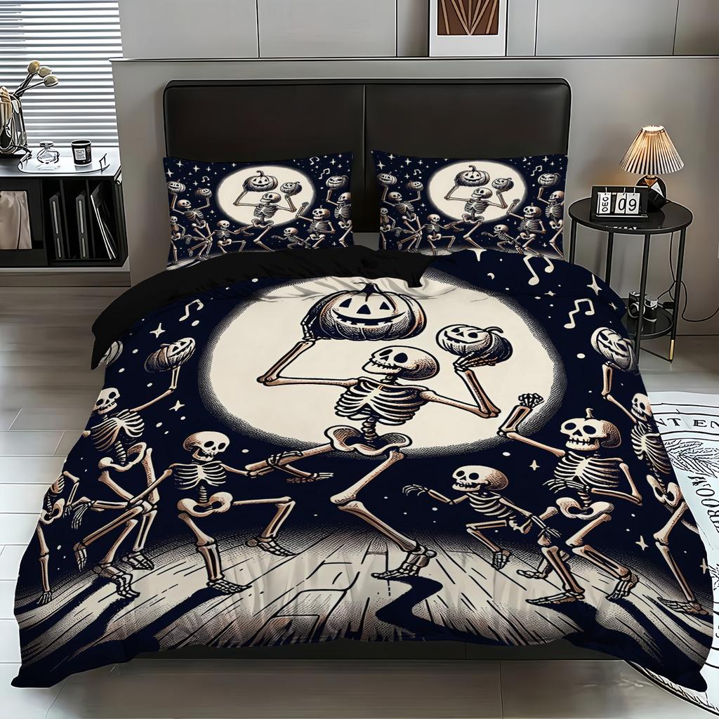 3-piece Halloween themed skeleton and pumpkin patterned duvet cover set, 1 duvet cover+2 pillowcases, coreless