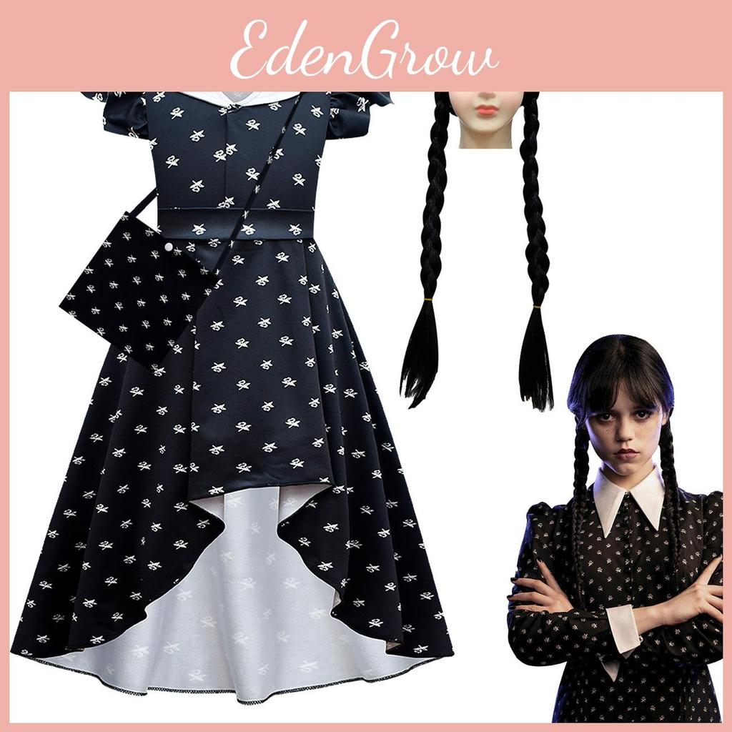 Wednesday Addams Dress Wig Cosplay Costume For Girls Kids Halloween Xmas Party