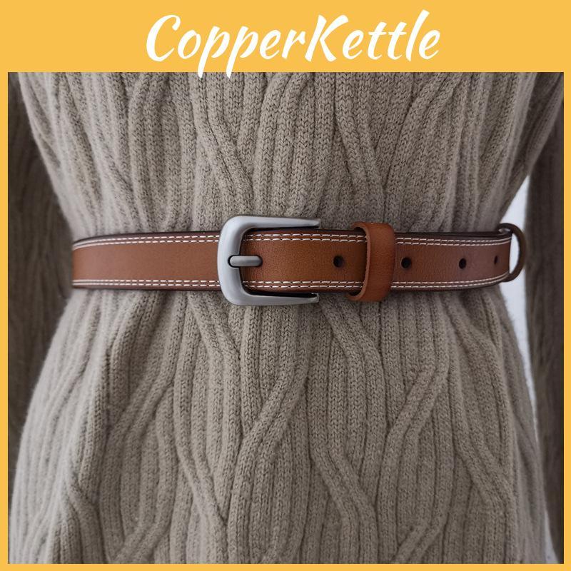 This women's belt features genuine cowhide leather with double-layer construction, delivering durability and a refined look. The alloy buckle with a pin closure ensures a secure fit, while the belt measures 2-4 cm in width and extends up to 115 cm in length. Suitable for office wear or street fashion, it enhances various outfits. Wipe clean with a damp cloth for maintenance.