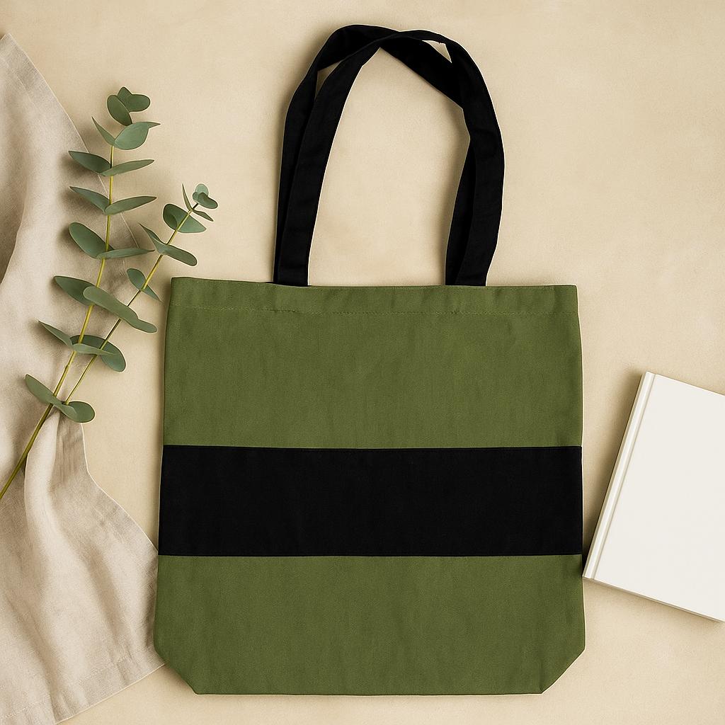 Woven cotton, clean lines, and grounded color—an olive body balanced by a wide black band. This tote is a functional, soulful companion, a carryall that blends practicality with quiet style so errands and journeys flow with mindful ease. 🌿