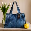 Crafted from natural cotton with a sturdy, breathable weave, it has a matte, tactile feel that wears in beautifully. The wide, flat straps in a lighter blue sit comfortably on the shoulder, and the open-top design makes for smooth, one-move access. You’ll notice the subtle crease lines and organic variations of the resist-dye process — each piece quietly unique. 🌀