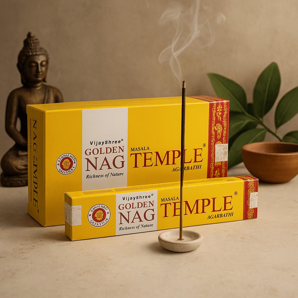 🛕 The first curl of smoke rises and the room softens — warm sandalwood unfurls with a gentle sweetness, the air turning still and attentive as Golden Nag Temple begins to glow.