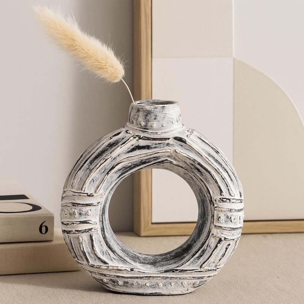 The eye rests on a calm, ring-shaped silhouette: a round donut form with a small neck and round mouth, finished in a soft cream that feels quietly refined. Its matte, hand-worked texture and raised bands catch the light in gentle rhythms, turning a functional vessel into a subtle statement that lifts any shelf, console, or dining table. 🏺