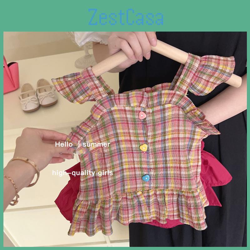 Adorable Korean Style Girls Cotton Two Piece Set For Summer With Sweet Checkered Design