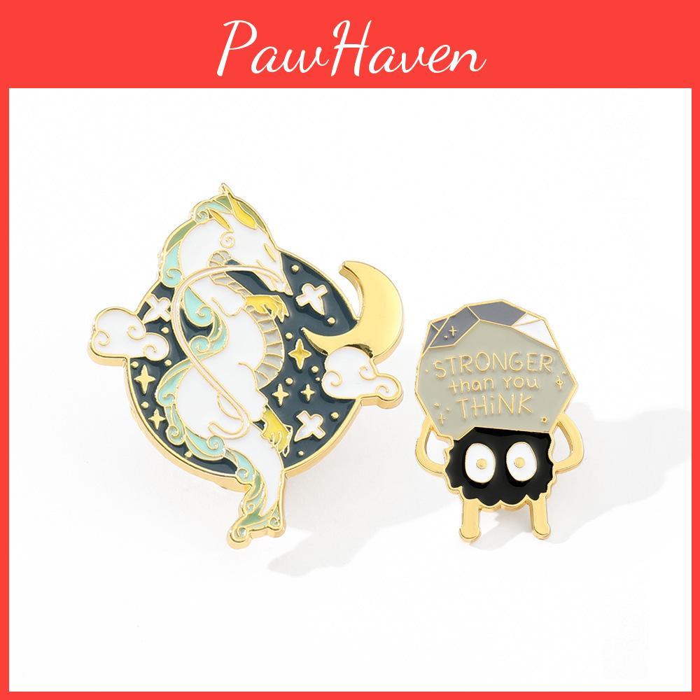 The brooch features a charming cartoon rendition of the iconic characters from the film, including No-Face, the enigmatic and captivating spirit, and Haku, the majestic white dragon. These characters are elegantly depicted in an enchanting yin-yang design, symbolizing the balance between good and evil. The brooch also includes additional options such as the adorable Soot Sprites, the mystical Moon White Dragon, and the charismatic Scarecrow Prince. With such an array of choices, there is a brooch to match every style and preference.