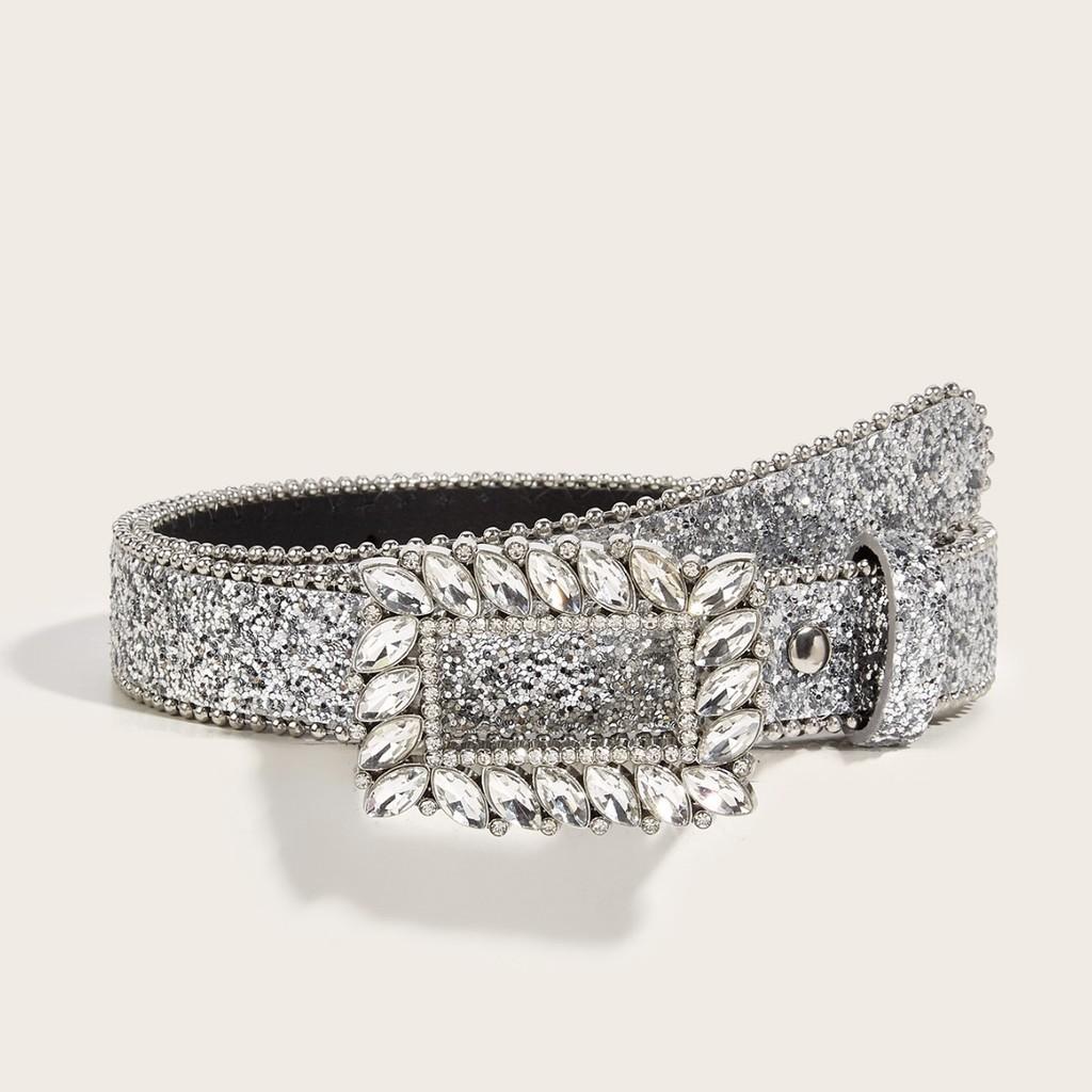 Trendy Square Rhinestone Buckle Pu Belt For Women Wide Waistband With Sparkling Acrylic Diamond Accent Fashionable And Stylish