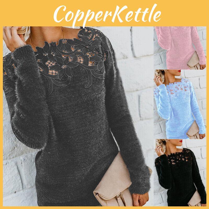 Cozy Women's Autumn Winter Fleece Sweater Tops With Elegant Lace Design For Style
