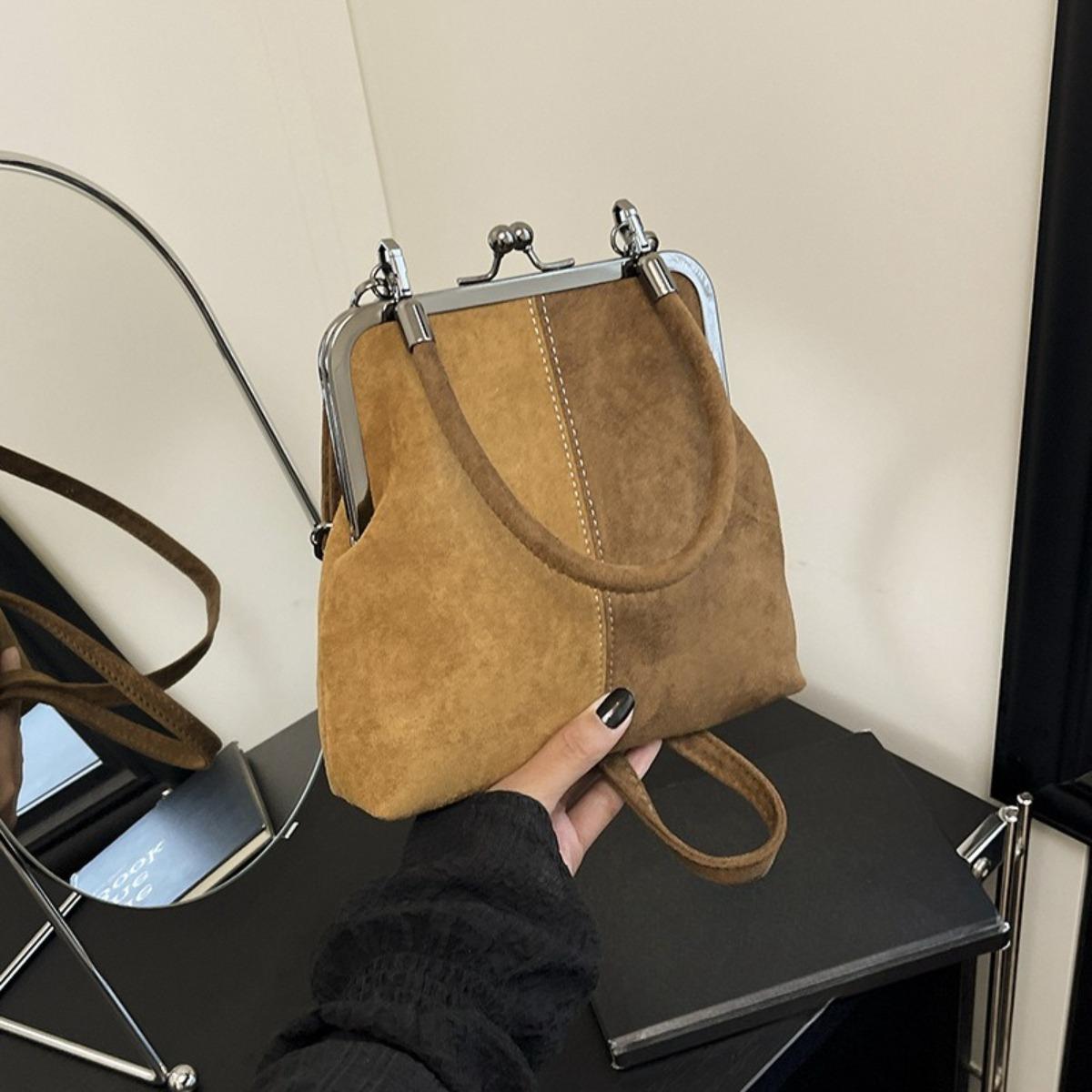 Geantă de umăr retro crossbody pentru femei din imitație de piele de căprioară, elegantă, cu culori contrastante, cu închidere tip sărut, geantă de mână mică cu curea de umăr detașabilă, geantă de mână de zi cu zi