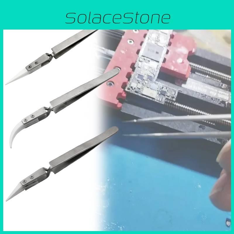 This stainless steel ceramic tweezer features anti-static properties and a precision tip for delicate handling. Its curved, reverse-angled design measures 13.5 to 14 cm, supporting a variety of precision tasks. Ideal for electronic assembly and laboratory work, it resists acids and maintains stability. Wipe clean with a damp cloth for easy maintenance.