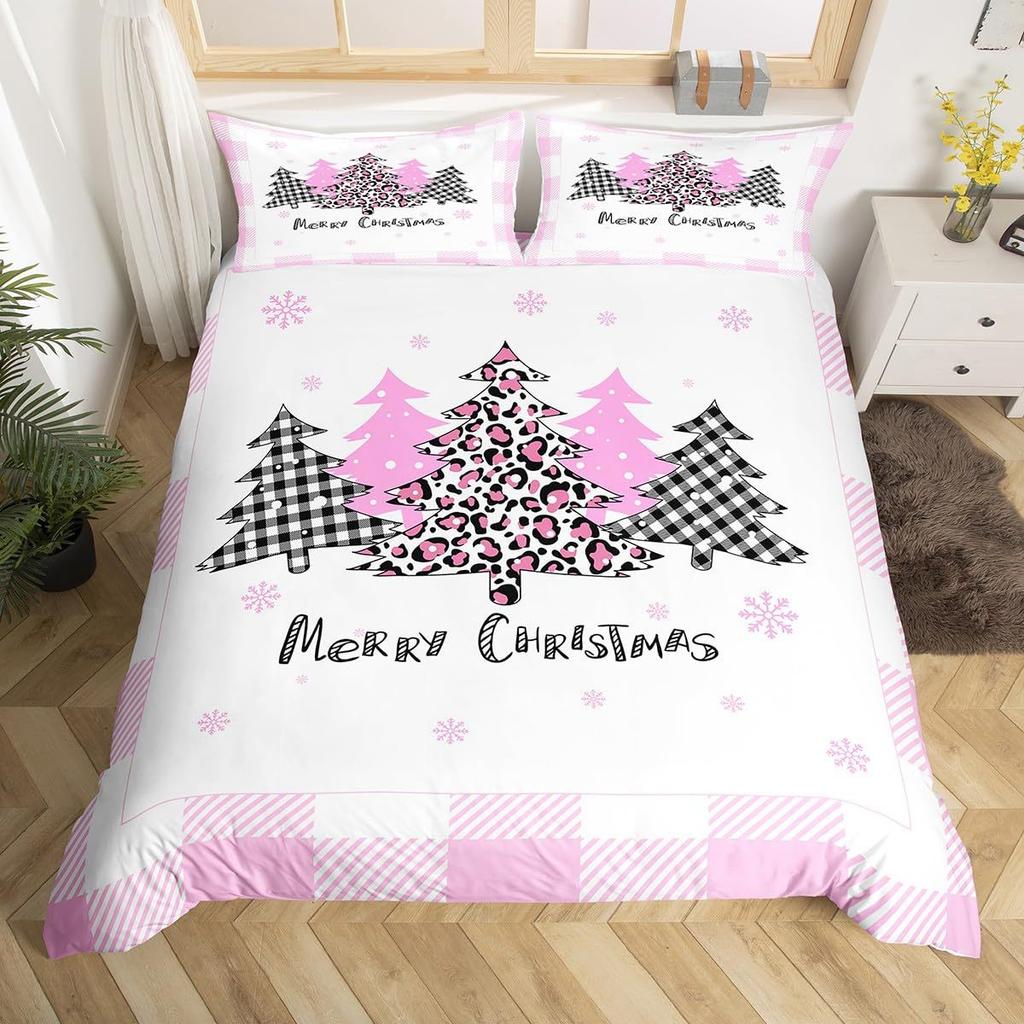 Pink Plaid Christmas Tree Three-Piece Quilt Cover 3D Digital Printing Bedding Set Bed Cover