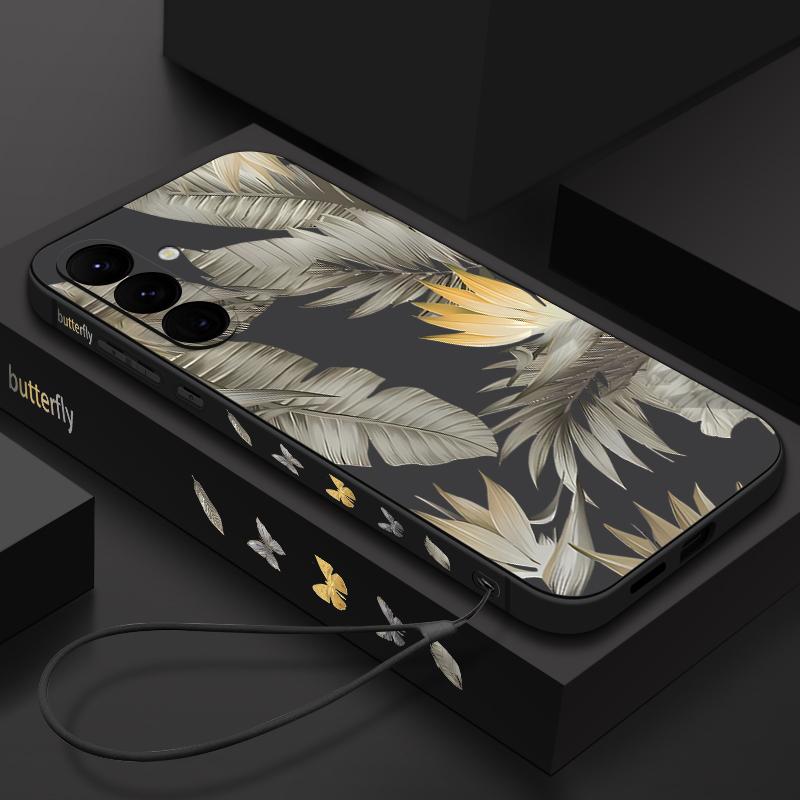Luxury Golden Leaves Texture Soft Cover For Samsung Galaxy A56 A17 A26 A16 A36 A55 A54 A53 A15 S24 S25 FE S25 S22 S23 Ultra Plus Lanyard Soft Cover