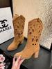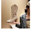 Moda 2024 Cizme occidentale vegane din piele intoarsa pentru femei, retro, varf rotund, cu tocuri, cu design scobit si nituri Cizme de cowboy pantofi