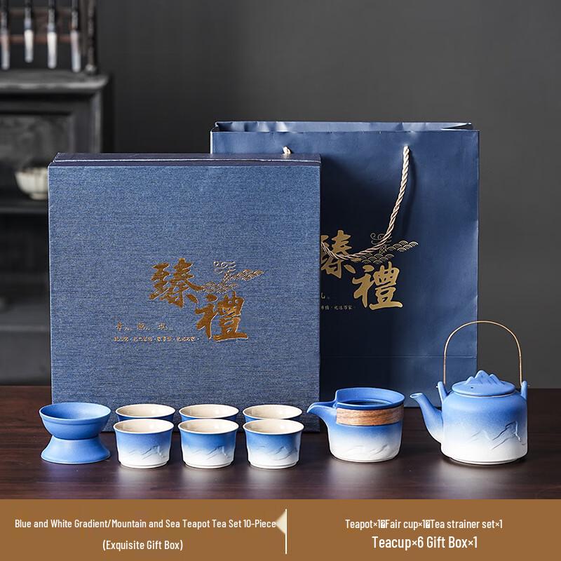 Retro Ceramic Tea Set with Blue-White Handle Pot