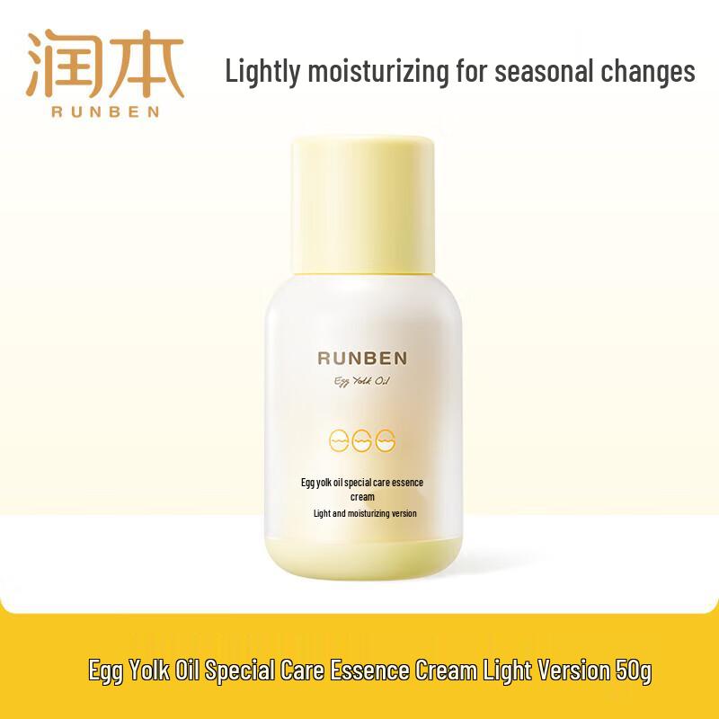 RUNBEN Egg Yolk Oil Special Care Essence Cream (Light Version) is a nourishing and moisturizing formula, presented in a 50g size. This 2024 edition is designed for gentle skin care.