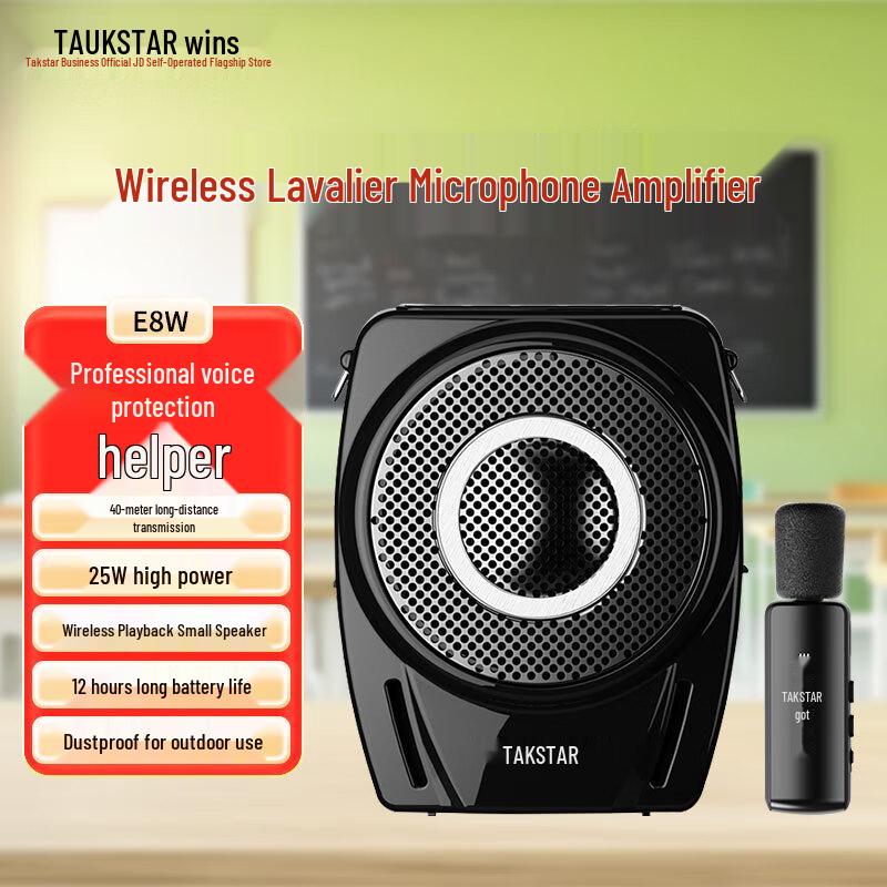 The TAKSTAR E8W Wireless Voice Amplifier (Lavalier Edition) delivers powerful, clear sound with extended battery life. It offers multiple playback modes, hassle-free frequency-free operation, and supports external USB storage. This portable device features a convenient lavalier clip, making it ideal for various professional and personal applications.