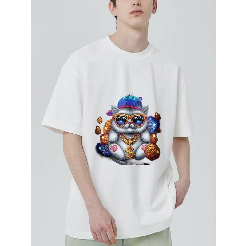 Crewneck T-Shirt Black Cat with Sunglasses and Gold Chain Print for Casual Wear