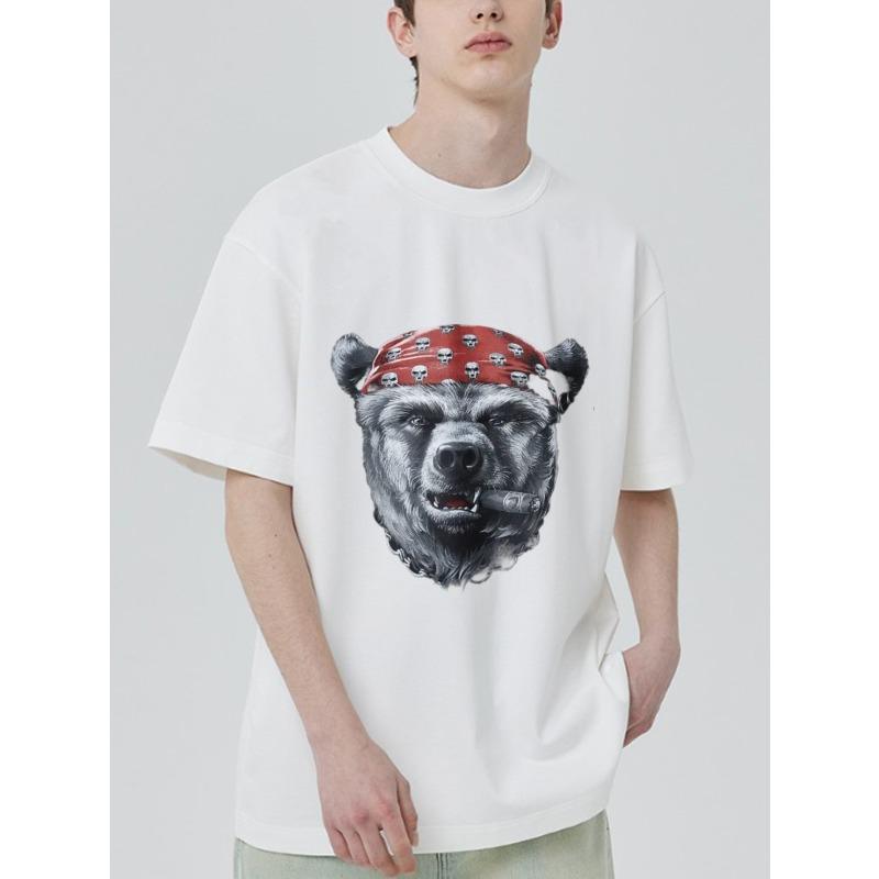 White T Shirt Bear Head With Red Bandana And Cigar Graphic Print Casual Streetwear For Men And Women