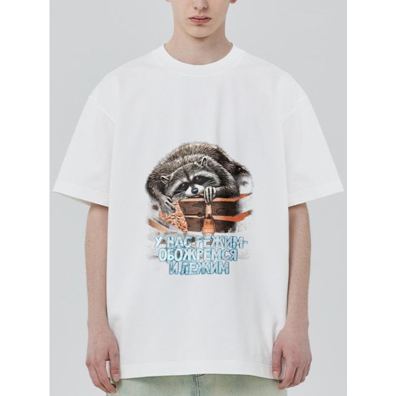 White T Shirt with Raccoon and Text Print for Casual Wear