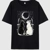 Oversized T Shirt Black Two Cats Under Moon And Stars Print Casual Wear For Women Summer Outfit Streetwear Fashion Top